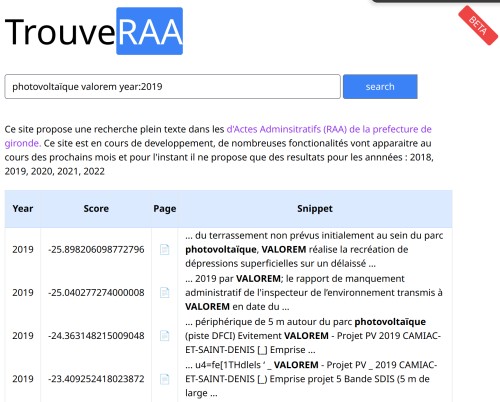 Testez TrouveRAA sur le corpus de la préfecture de Gironde. Chaque année des milliers de pages de délibrations sont prises. Nous vous donnons la possibilité d'essayer l'outil sur un jeu de donnée reduit : 2018,2019, 2020, 2021, 2022. Cela représente 81472 pages.